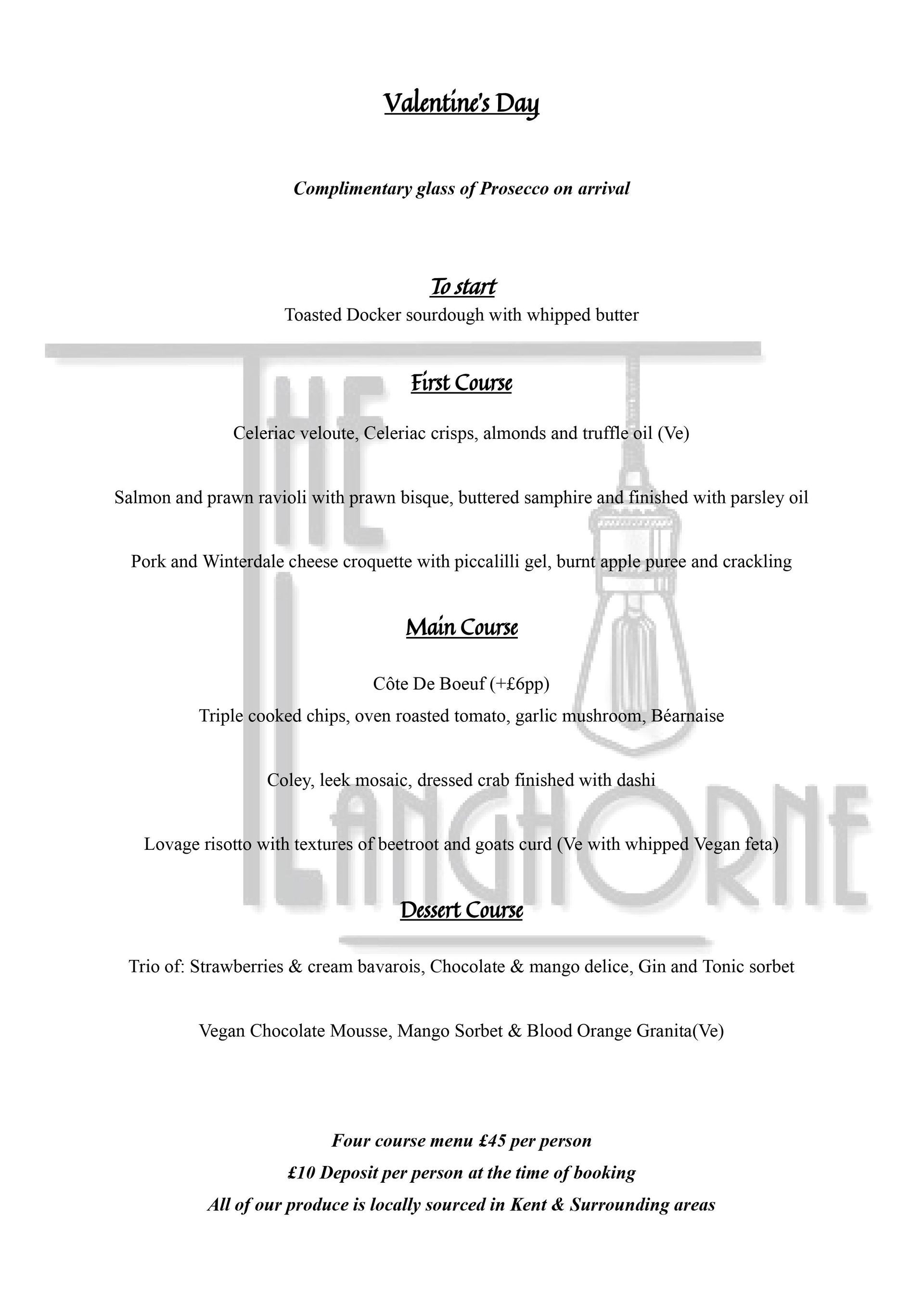 Four Courses £45 per head. Complimentary Glass of Prosecco on arrival.